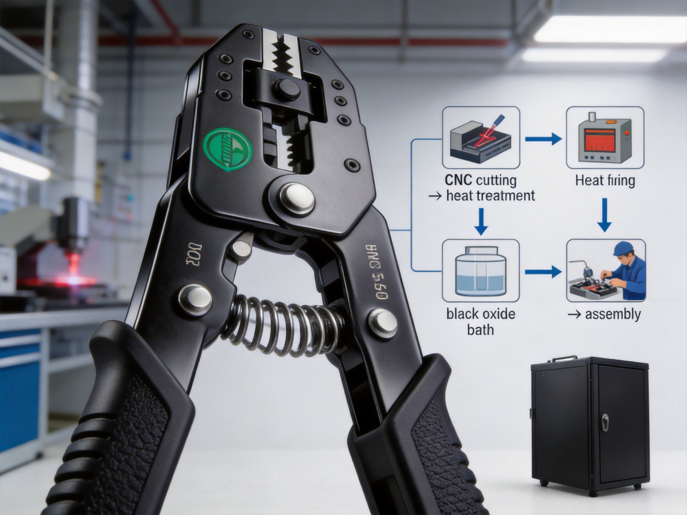 A: The SMT-310 undergoes several key processes: (1) CNC precision cutting for exact part dimensions; (2) heat treatment (quenching and tempering) to harden the steel frame to HRC 55-60; (3) black oxide coating for corrosion and wear resistance; and (4) rigorous functional testing (200 crimp cycles) and durability testing (1-meter drop test) before shipment.