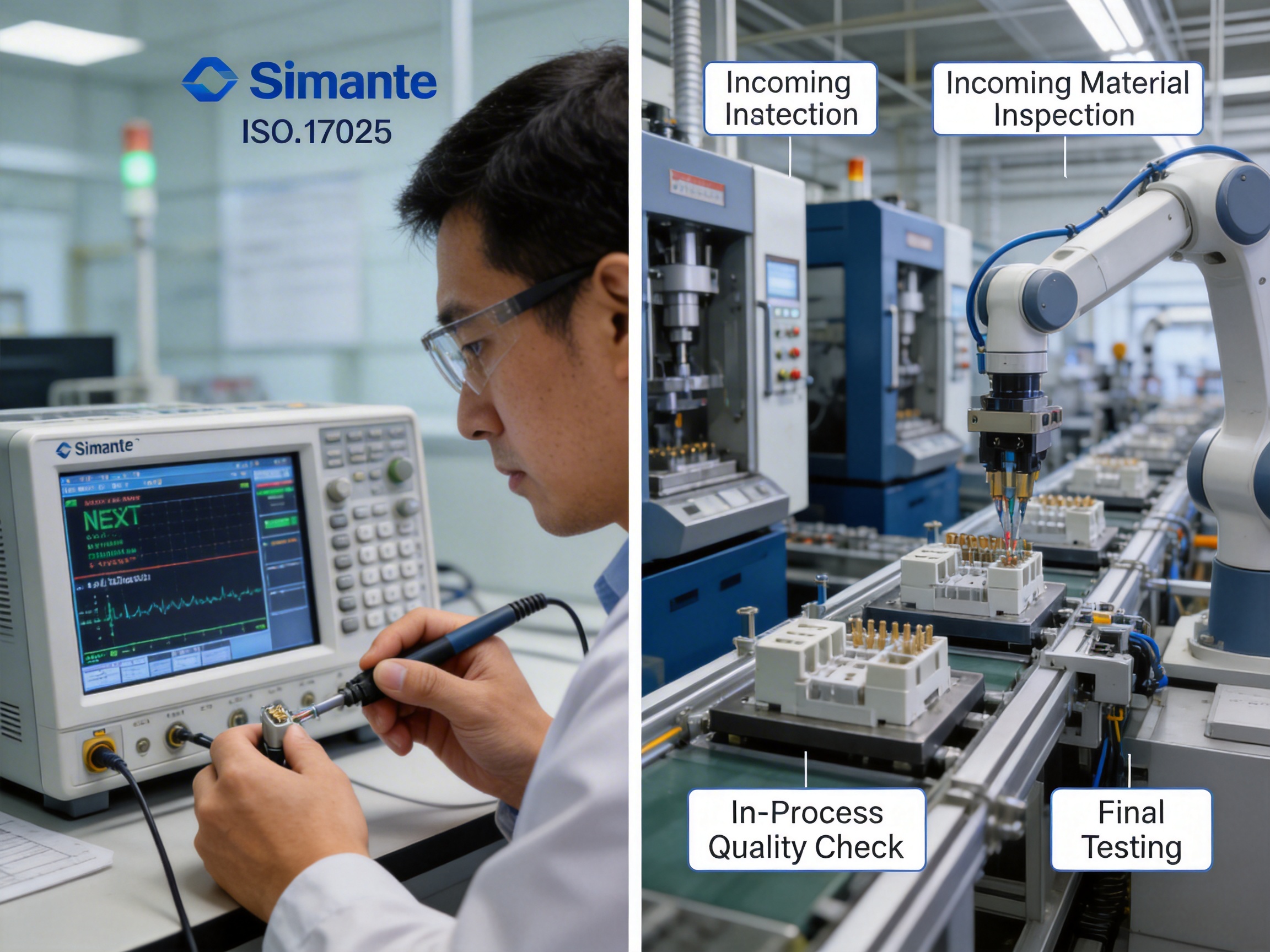 Simante’s design and development team consists of over 10 engineers and 30 full-time technical staff, all with extensive experience in structured cabling and network communication. The team follows a customer-centric approach, collaborating closely with clients to understand their specific needs and develop tailored solutions. For the SMT-1069D8C6A, the team spent 12 months refining the 180-degree IDC design, conducting hundreds of signal integrity tests to optimize the jack’s performance.