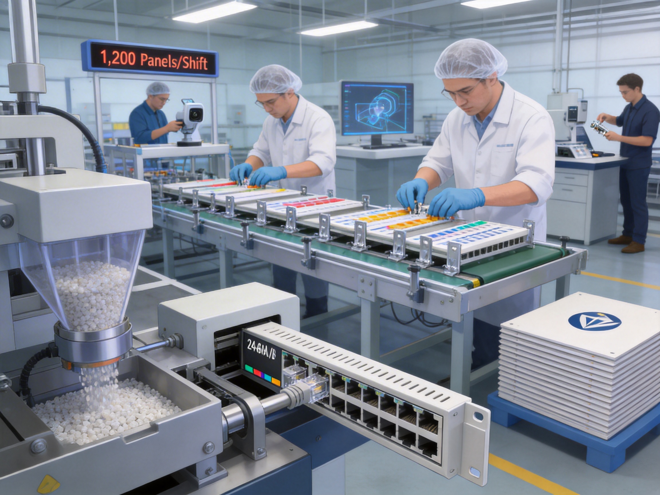 - Injection Molding: 10 fully automatic machines produce the panel body with a dimensional tolerance of ±0.01mm—ensuring perfect alignment of ports and keystone jacks. This precision prevents loose connections and signal loss. Each machine runs 24/7, producing 1,200 panels per shift.