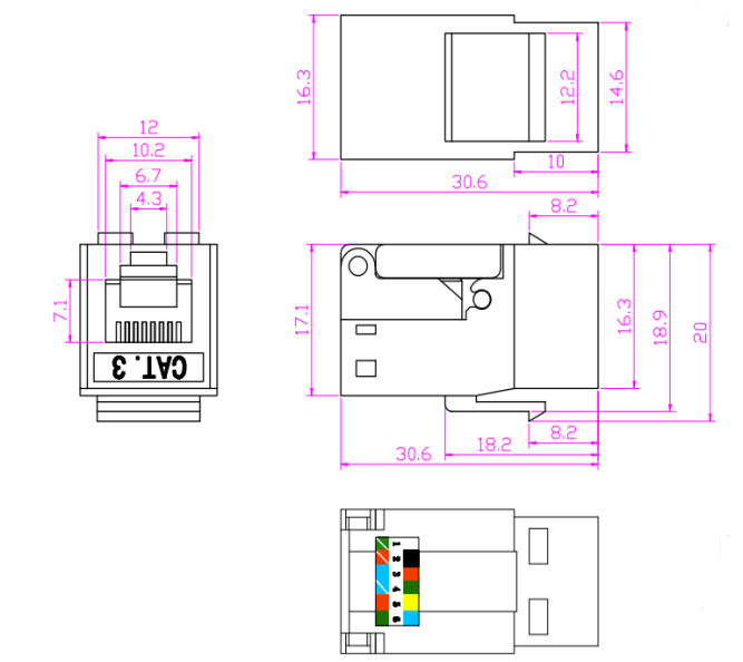 A CAT3 keystone jack is a type of connector used in structured cabling systems to terminate and connect twisted-pair cables, such as those used for telephone lines. The "CAT3" designation refers to the category of the cable that the jack is designed to support, in this case Category 3. This type of cable is able to support data rates up to 16Mbps and is commonly used for telephone and 10Mbps Ethernet networks.