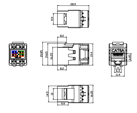 Color Coding: Keystone jacks often feature color-coded wiring schemes to ensure proper alignment and termination of the copper cables. The color-coding follows industry standards, such as T568A or T568B, to maintain consistency and compatibility within the cabling system.