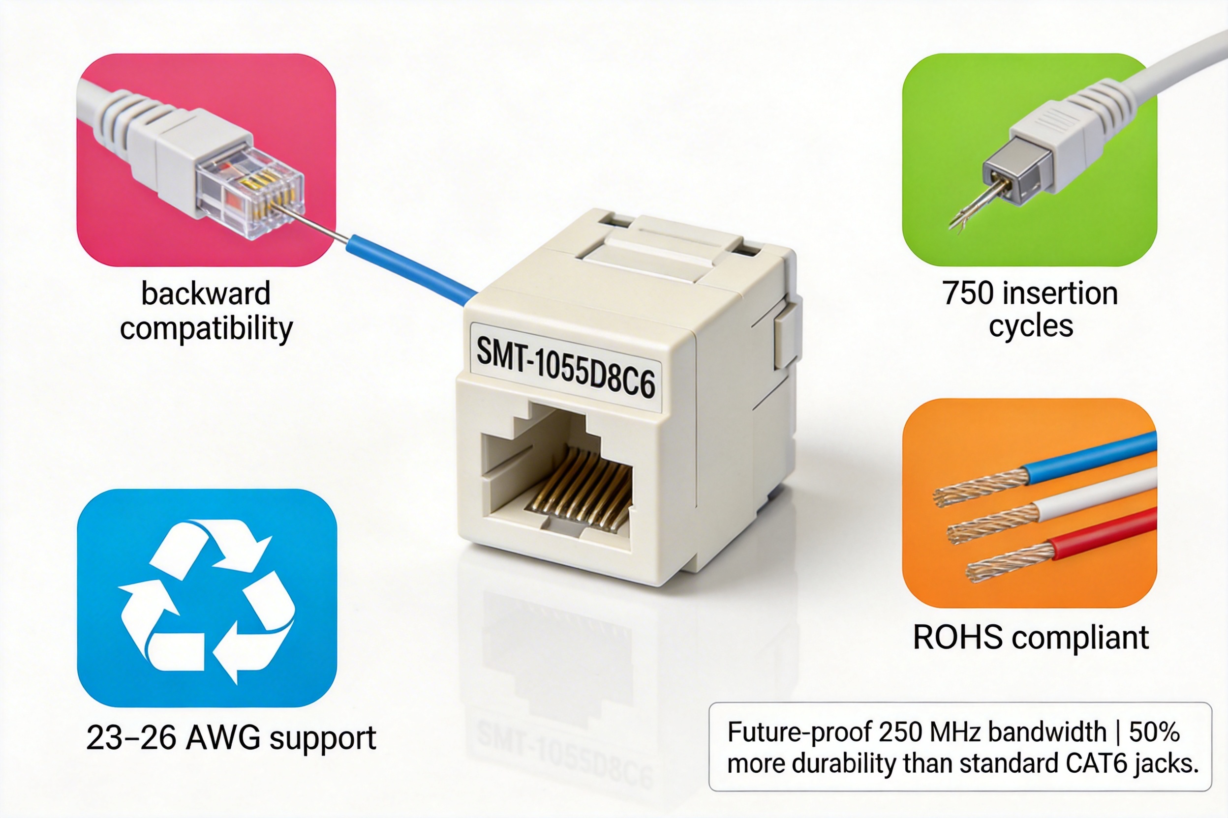 | Parameter | SMT-1055D8C6 CAT6 Keystone Jack | Standard CAT6 Keystone Jack | Advantage |