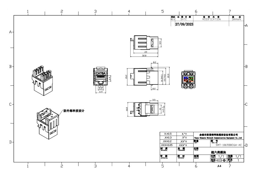 Color Coding: Keystone jacks often feature color-coded wiring schemes to ensure proper alignment and termination of the copper cables. The color-coding follows industry standards, such as T568A or T568B, to maintain consistency and compatibility within the cabling system.